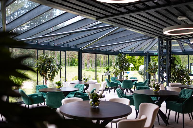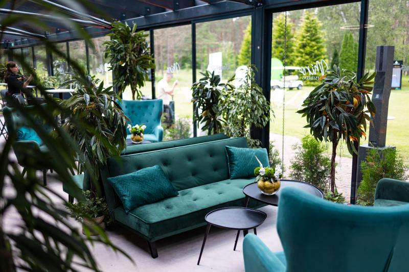 Terase ir veidota tā, lai komforts būtu nodrošināts visa gada garumā – tai ir jumts un apsildāma vide, kas ļauj baudīt pasākumus arī ziemas sezonā. No terases paveras burvīgs skats uz apkārtējo dabu – zaļojošu mežu un prestižo golfa laukumu, radot patiesi īpašu noskaņu.