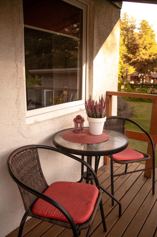 Trīs dzīvokļi (2, 3 un 4-vietīgi) mājas otrajā stāvā ar plašu terasi un skatu uz dārzu.